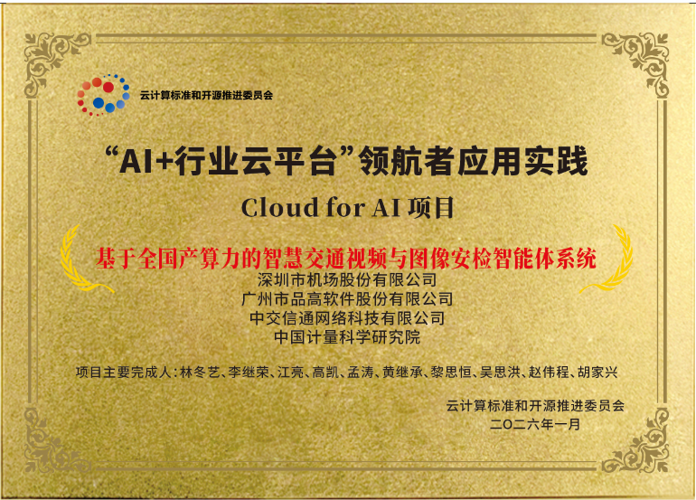 经过多轮评定,由深圳市机场股份有限公司、广州市品高软件股份有限公司、中交信通网络科技有限公司、中国计量科学研究院联合申报的《基于全国产算力的智慧交通视频与图像安检智能体系统》项目脱颖而出,成功摘得Cloud for AI(云支撑AI规模化应用)领域“AI+行业云平台”领航者应用实践奖项!
