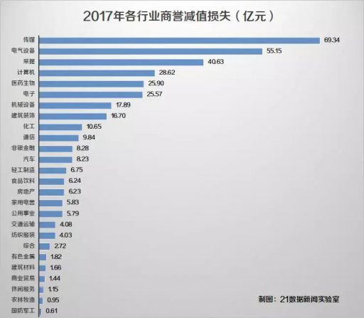 年报显示,2017年商誉减值损失大幅增加,传媒行业以69.34亿“拔得头筹”,电气设备、采掘业紧随其后。而从目前年报预告来看,这些行业在2018年商誉减值风险依然居前。