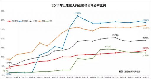若从资产占比来看,以商誉占净资产比例超过10%的传媒、休闲服务、计算机、医药生物、家电等五大“轻资产”行业来分析,虽说总体商誉大增在2014年至2016年,但细分来看,传媒行业商誉主要在2014年至2016年一季度形成;休闲服务相对滞后,2015年至2016年中爆发,在2016年中报占比曾高达32.49%;家电随后,主要集中在2016年-2017年中,计算机与医药生物则保持持续上涨。