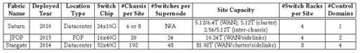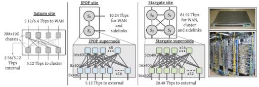 为了应对数据中心流量的快速增长,Google 2009 年在数据中心部署了第四代机框式 Saturn(土 星)交换机,可以在半高机箱中支持 288x10GE 接口,单槽 240Gbps, 一个机架支持 5.76T。相比 同期厂商路由器设备,大部分仅仅支持单槽 40G。(CRS-3 2010/2011 年全高机箱支持 140G/Slot x 16 = 2.24T)。Saturn 图片上面的 Pizzabox 是同样 24x10GE 的 TOR 交换机,接 10GE 的服务器。