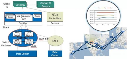 B4 的流量调度,首先通过 Center TE server 搜集全球 DC Cluster 的流量发送请求。通过 SDN Gateway 调节全球 12+ DC site 之间的流量。Google 是第一家公司采用 SDN 技术,在跨洲光缆链 路做到链路利用率 98%以上。
