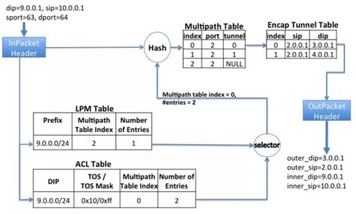 Openflow 表比 LPM 表项更优先,如果 Openflow 表项失败,自动按照 IGP/LPM 表项转 发。如下图所示:在 Encap Switch 上,有 IGP 算出来的 9.0.0.0/24 地址,因为配置了 FlowGroup SDN/ACL entry, 所以转发按照 ACL 找到 Multipath index=0,然后根据 Hash 结果发送到两个 tunnel。