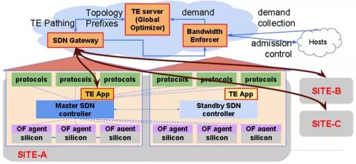 Google 全球 TE 服务器,搜集从 BwE(带宽控制)汇聚来的各个 DC Cluster 主机流量请求,并接 受允许 host 发送流量。TE 服务器跟 SDN GW 网关来通讯,指导 B4 采用 Hybrid SDN 模式,拓扑 发现采用 IGP,对于 Tunnel 和 flow 的管理采用 OpenFlow,最早采用 ACL 来映射相应 prefix 到不 同的 tunnel,后来改为 VFP/LPM 表。