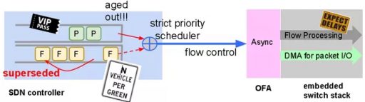 Google 的解决方案是在 controller 里把协议报文,和 Flow Rules 的放到不同优先级的队列,采用 Token based Queue,只有协议报文发送完毕才进行 Flow Rule 的调度。并且在 OFA 侧采用异步调度。极大的提高了控制器的稳定性。