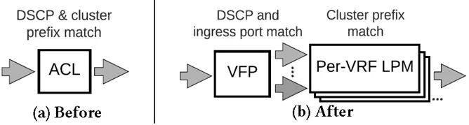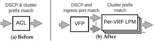 『点评』:在 B4 定制化的场景,SuperNode 仅仅承载内部架构的 Prefix,类似 BGP free Core 的设 计理念,仙女座(Andromeda)主机 overlay 管理的客户的真正路由。把流量分类从 ACL 表转移到 FIB 表 LPM 是个很自然的选择。