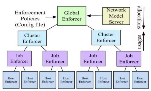 ● BwE 修改了 Linux 网络协议栈,任何 Container 发出的流量,都可以被识别,每 5 秒钟间 隔,Host 汇报流量情况。并且汇聚 Task/Job/User/Cluster 的流量要求,最后汇聚成 SiteSite 的流量请求。并且能够根据历史流量数据,进行带宽预留的预测。如下图所示: