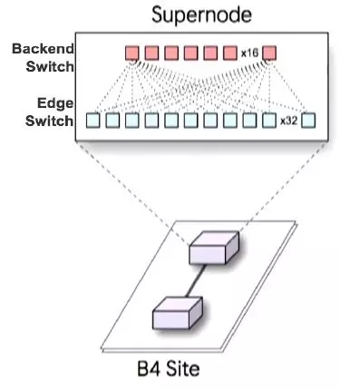 B4 控制器在每个 Site 有多个 SDN 控制器,一般一个控制器管理一个 building 里面的几十台交换机 (SuperNode 超级核心)。