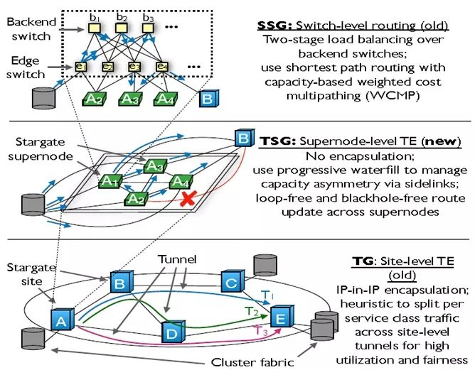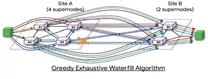 在 TSG 上的层次化 TE 调度采用 Greedy Exhaustive Waterfill 算法,白皮书里用了很多篇幅讲解,实际上对于网工来讲就是利用 Stargate 之间的 Side Link 做一个 LFA(Loop Free Alternative)。